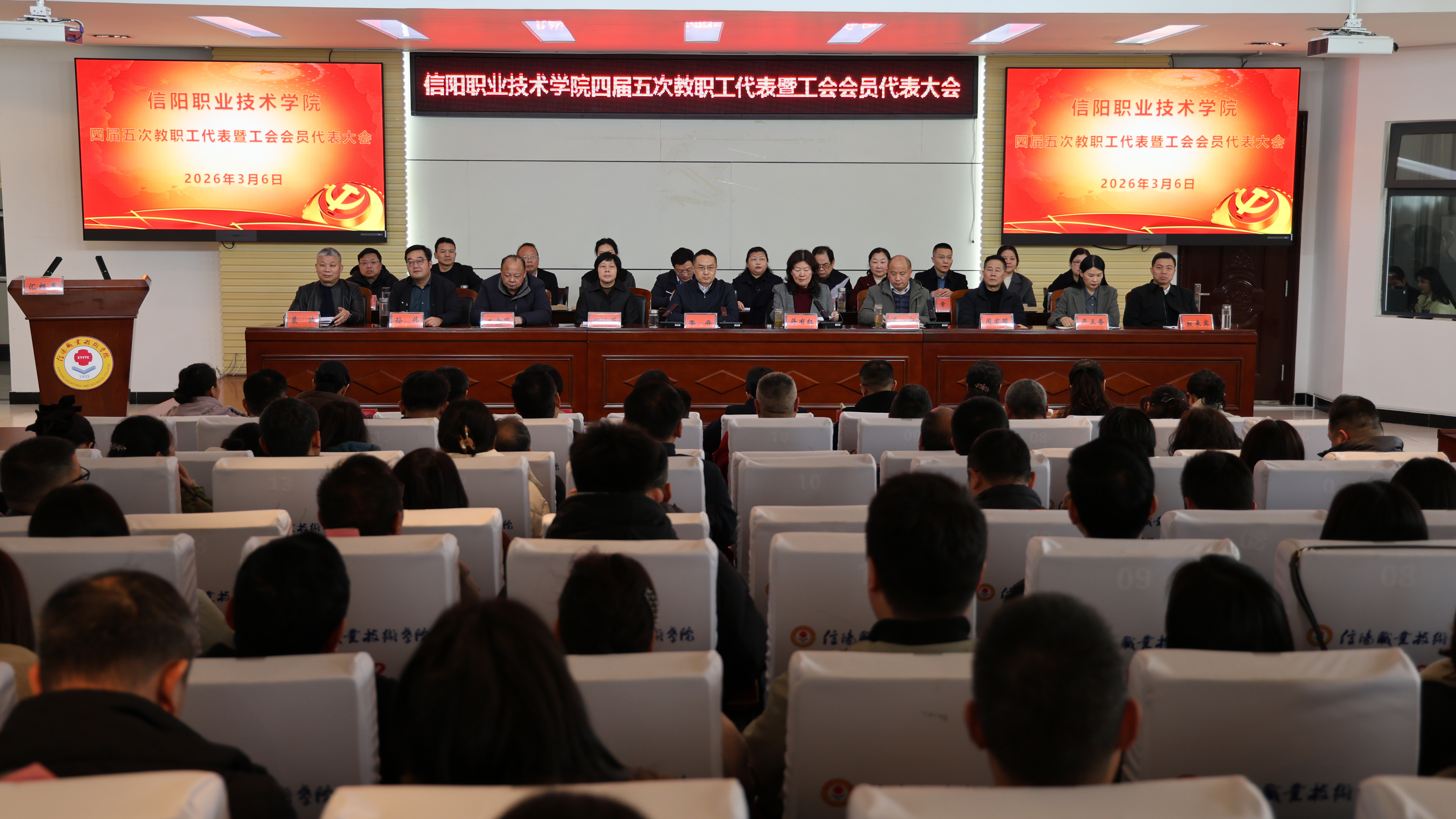 3月6日,信阳职业技术学院第四届教职工代表暨工会会员代表大会第五次会议成功召开。学校领导班子出席会议。115名正式代表和20名列席人员参加会议。